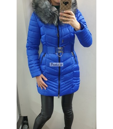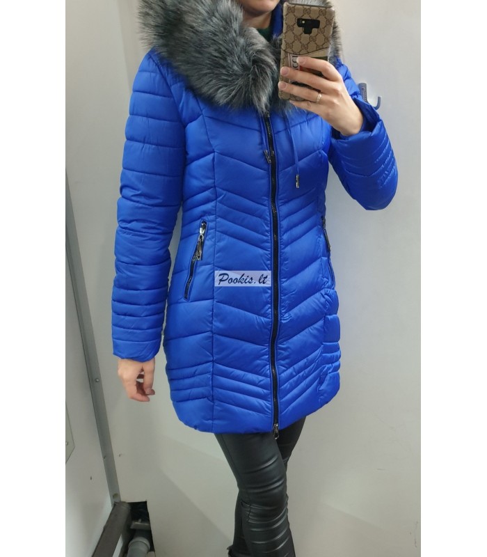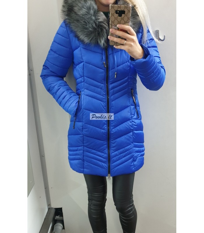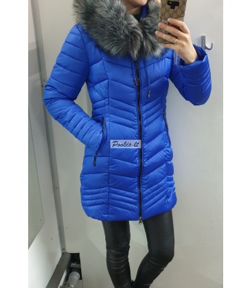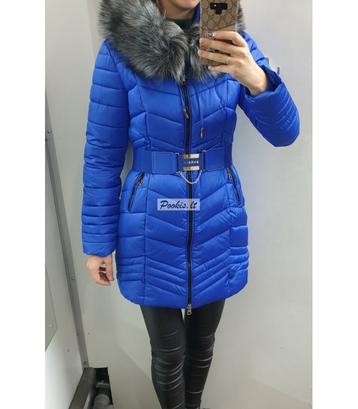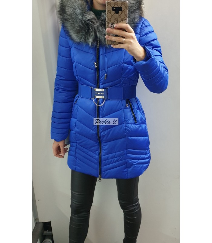 Daili įliemenuota ilgesnė prigludusi striukė. Su kapišonu, kailiukas nusiima. Užtrauktukas atsisega iš viršaus ir apačios. Parduodama su diržu per liemenį.
