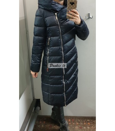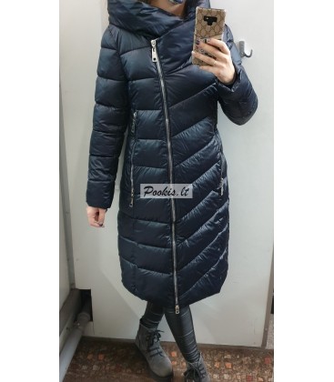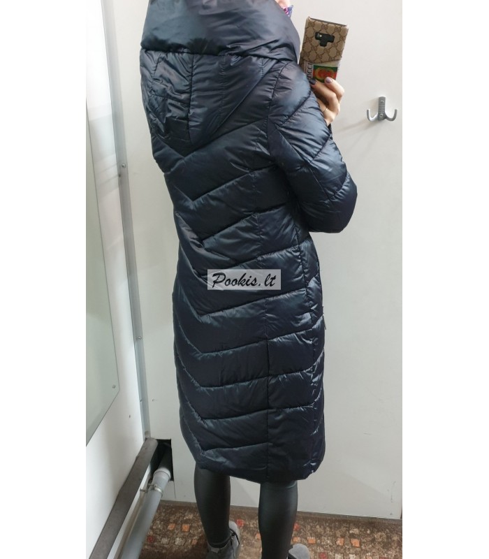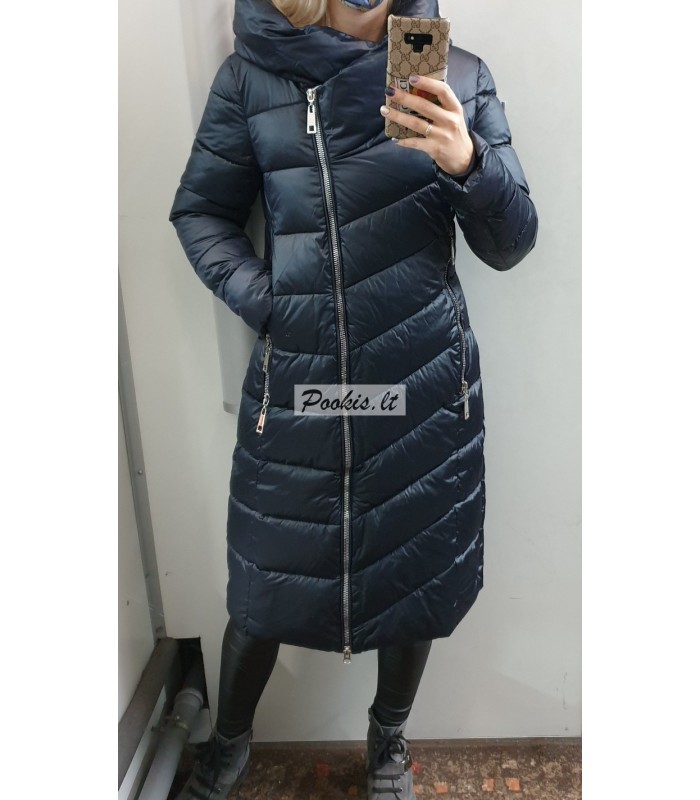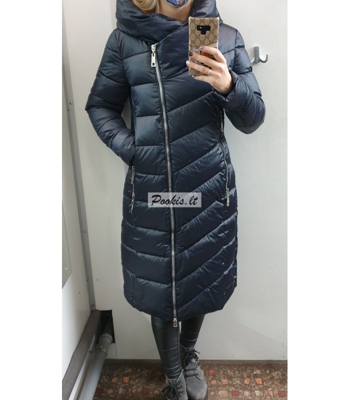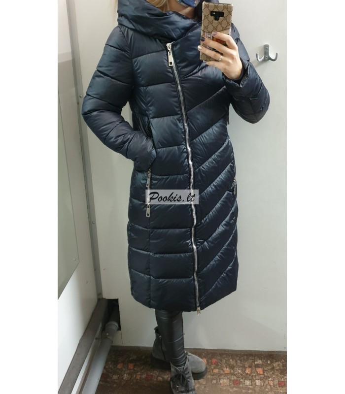 Daili ilgesnė tamsiai mėlyna striukė - paltukas su užtrauktuku per šoną. Užtrauktukas atsisega iš viršaus ir apačios.