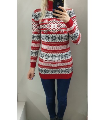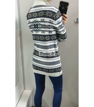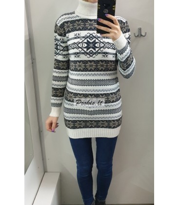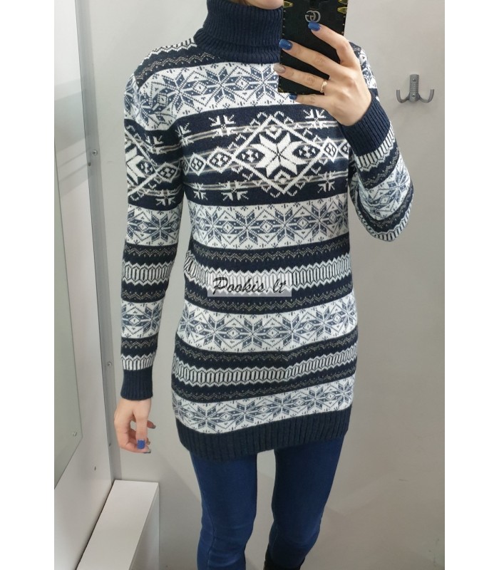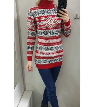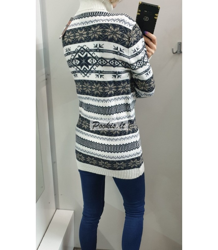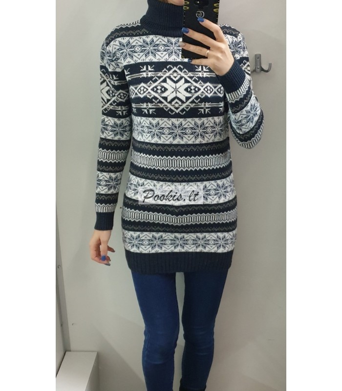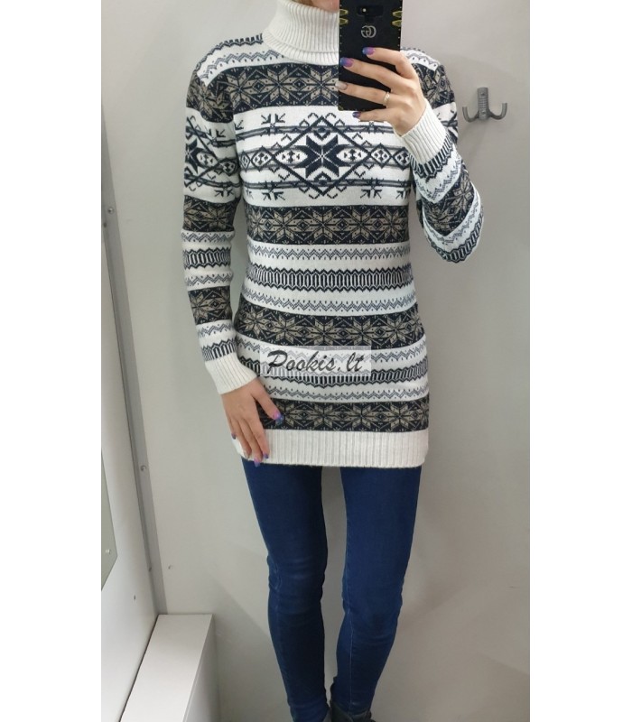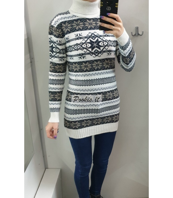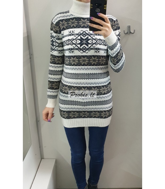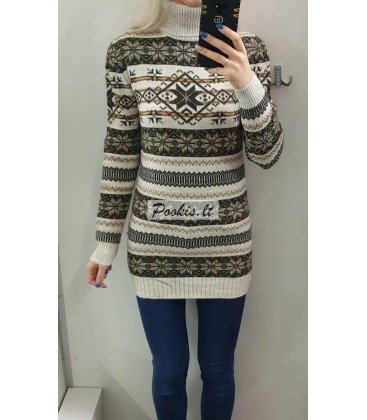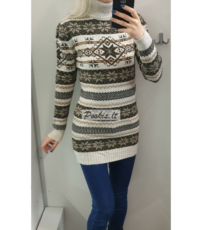 Dailus raštuotas šiltas ilgesnis megztinis aukštu kaklu.