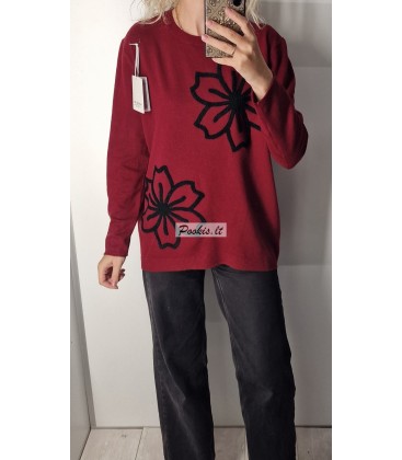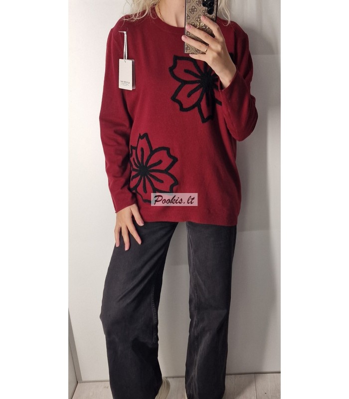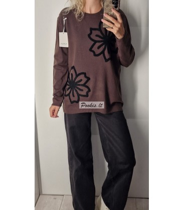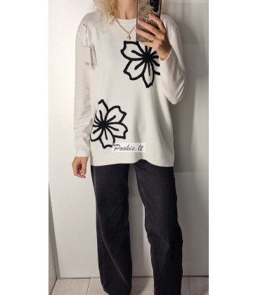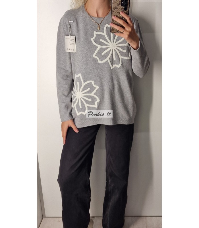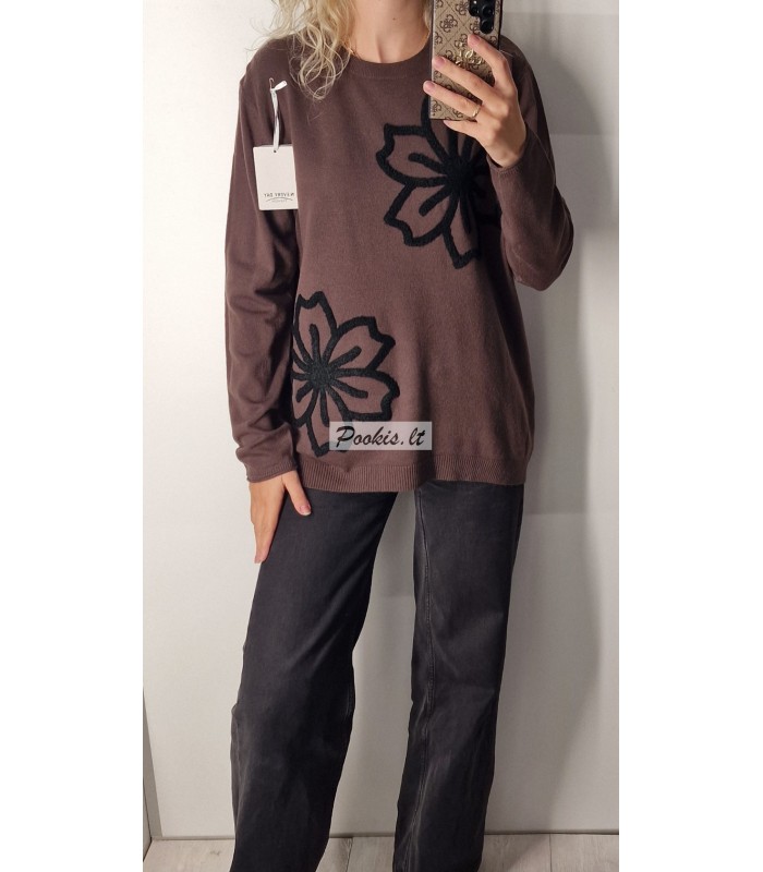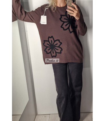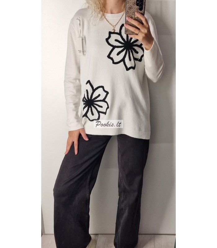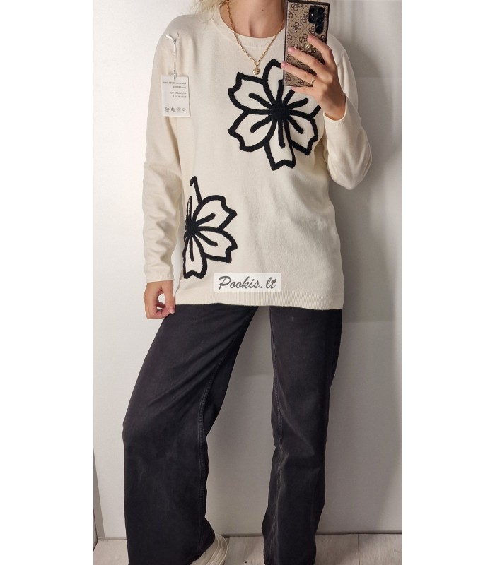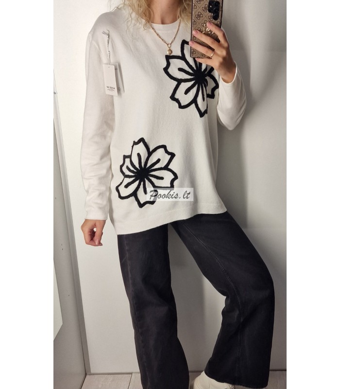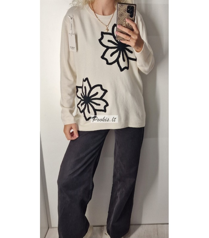 Dailus didesnio dydžio plonas megztinis su įaustomis gėlėmis.