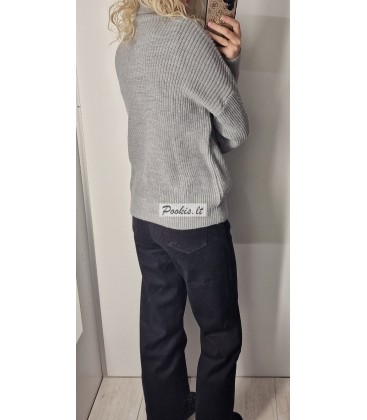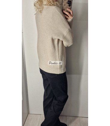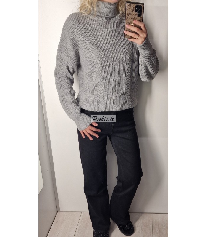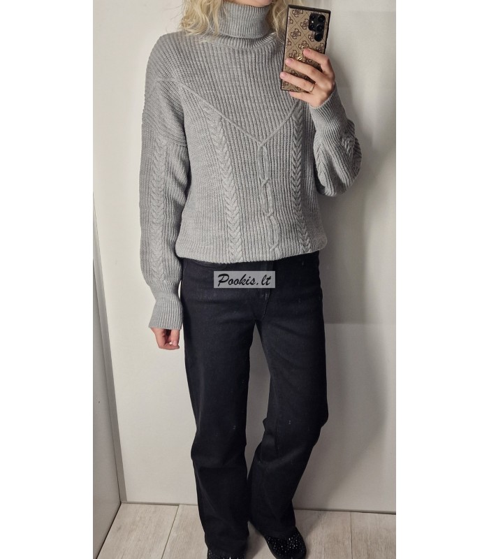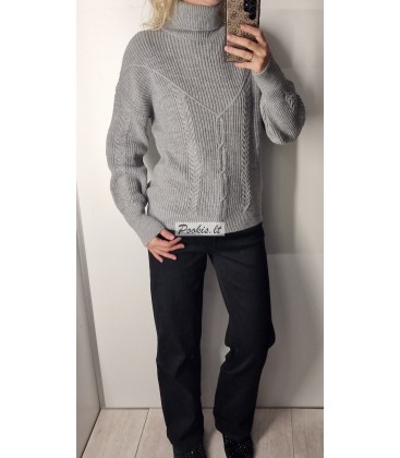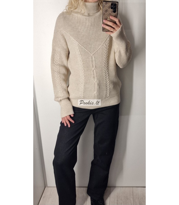 Dailus didesnio dydžio megztinis su aukštu kaklu ir pynėmis.